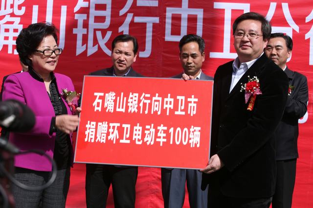 开业仪式上,石嘴山银行董事长李登芳代表石嘴山银行向中卫市环卫工人捐赠了100辆价值75万元的电动环卫车,用于改善中卫市环卫工人的工作设备,帮助环卫工人提升工作效率,促进中卫市市容市貌的改善。